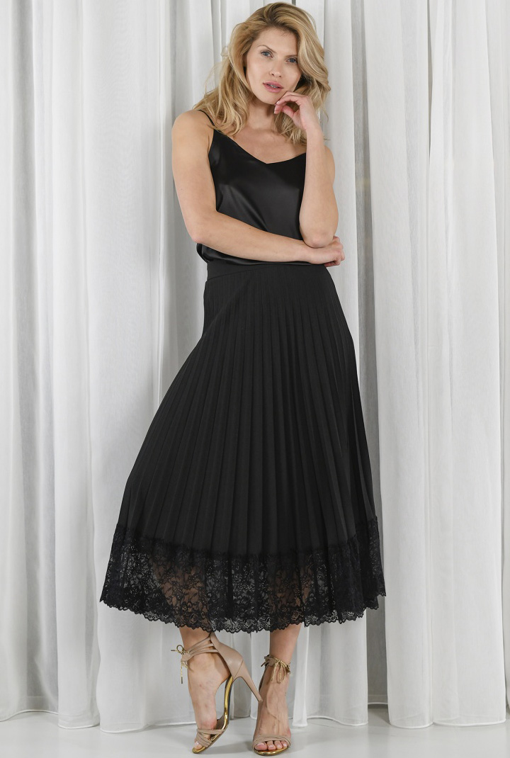 Czarna plisowana spódnica z pozoru jest klasyczna i wtapia się w otoczenie, a tak naprawdę staje się bazą, na której możesz się twórczo spełniać. Rano już raczej nie będzie Ci potrzebna filiżanka mocnego espresso. Mimo, że koronkowy dół dodaje jej wieczorowego charakteru, z powodzeniem możesz ją nosić również na co dzień. W naszej filozofii ze spódnicami nie rozstajemy się 24 godziny na dobę!