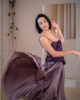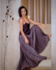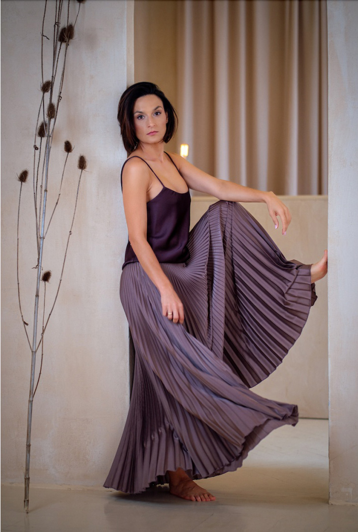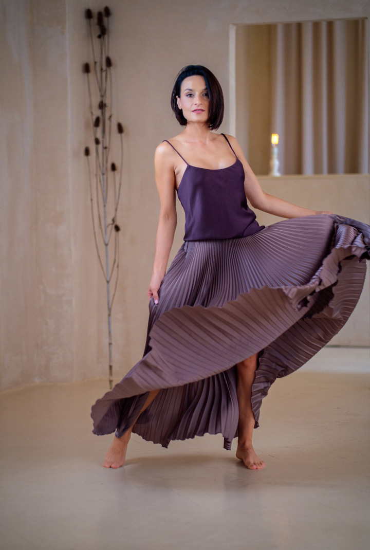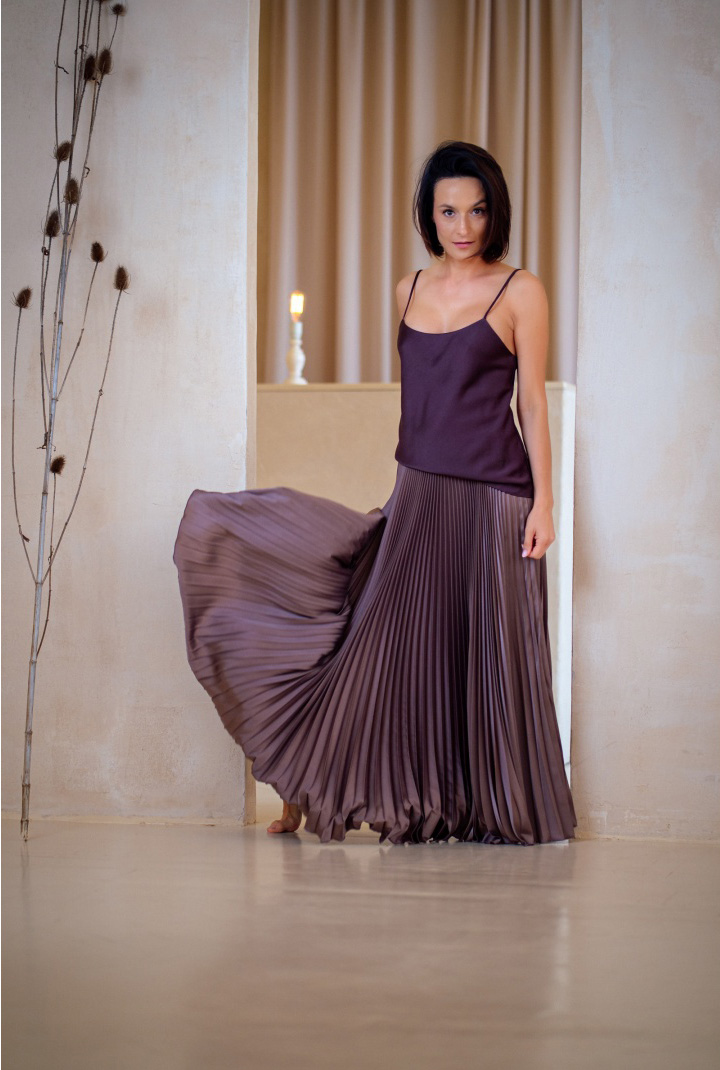 Mocha Mousse jest niesamowicie aksamitna i połyskująca, jak desery najznamienitszych cukierników. Samo patrzenie na nią sprawia przyjemność, a to sposób, w jaki materiał łapie światło, nadaje całości charakter – elegancki, miękki, z lekkim pazurem. Plisy żyją własnym życiem. Trudno odwrócić od niej wzrok i oprzeć się temu hipnotycznemu uczuciu.