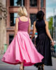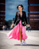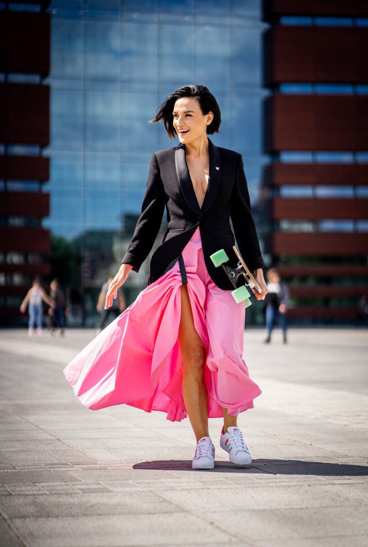 Ten krój nie tylko fantastycznie podkreśla talię i jest przeciwwagą dla ramion (przez co optycznie tworzy figurę klepsydry). Różowy kolor noś z pasującymi do niego pastelami, albo pozwól mu błyszczeć zakładając łagodne szarości, beże i czerń.